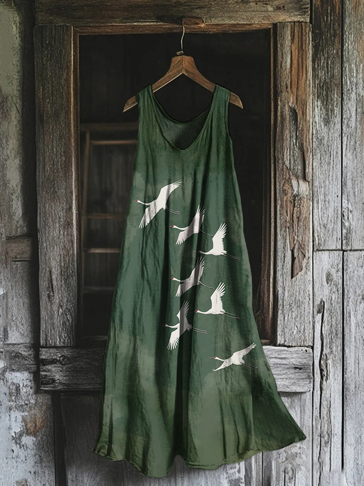 Cranes Japanese Art Cotton Linen Comfy Tank Dress