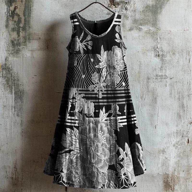 Floral Japanese Traditional Pattern Linen Tank Dress