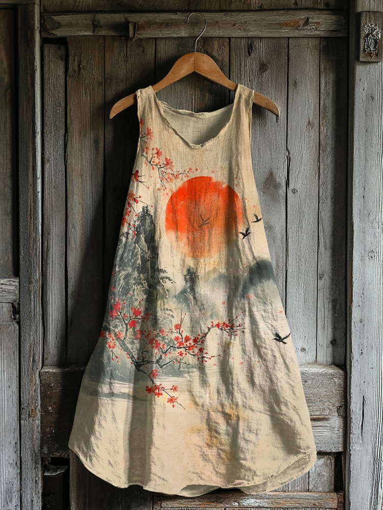 Vintage Art Of Japanese Landscape With Birds And Cherry Blossom Art Print Linen Tank Dress