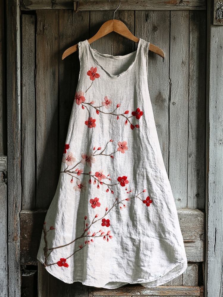 Vintage Cherry Blossom Art Print Linen Tank Dress