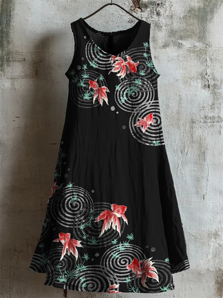 Vintage Goldfish Ripples Japanese Art Pattern Linen Tank Dress
