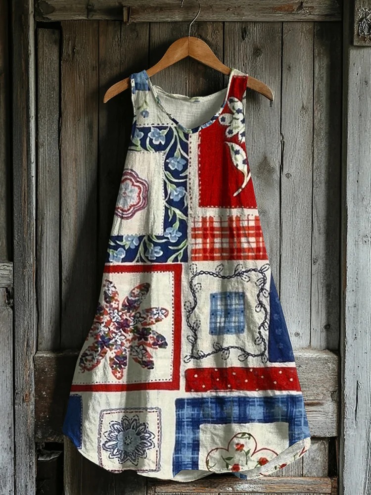 Vintage Independence Day American Geometry Floral Print Linen Tank Dress