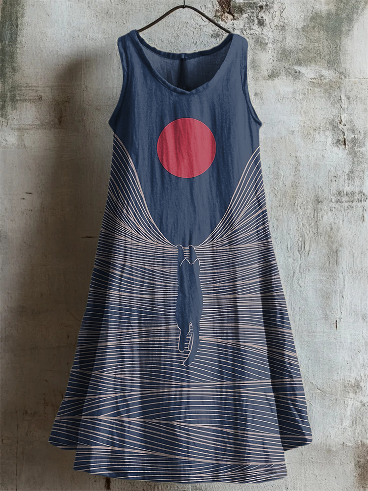 Vintage Japanese Art Cat And Setting Sun Pattern Linen Tank Dress