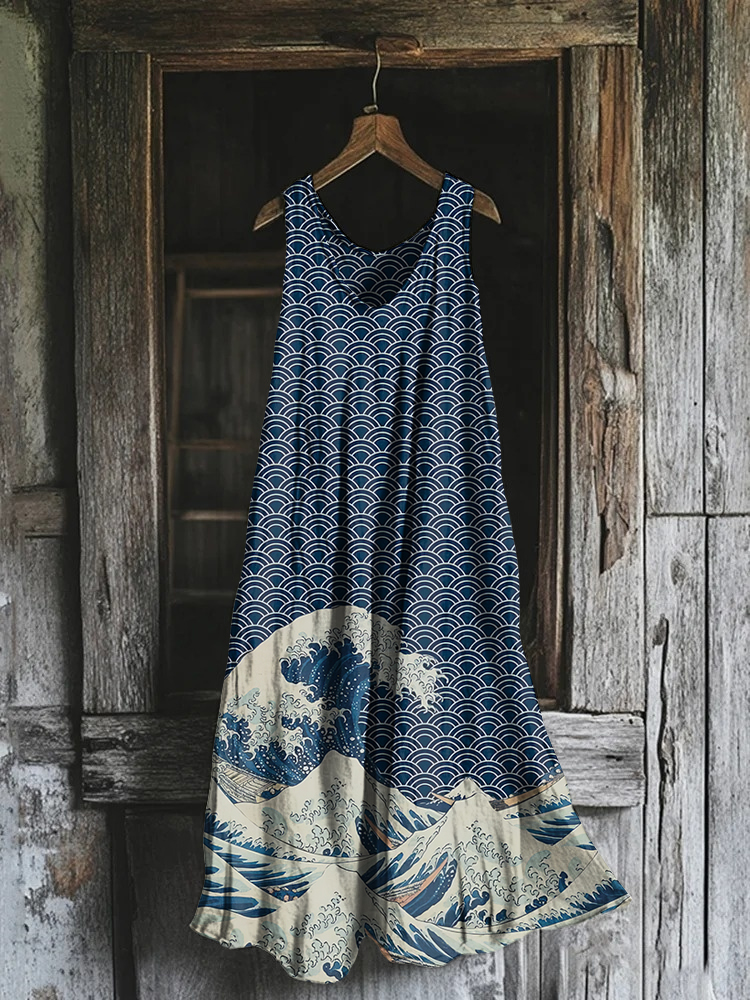 Vintage Sea Waves Art Cotton Linen Comfy Tank Dress