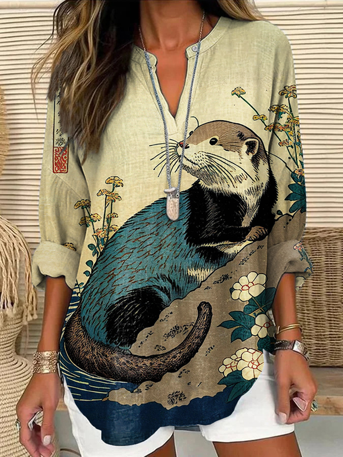 Floral Otter Water Japanese Art Print Linen V-neck Shirt