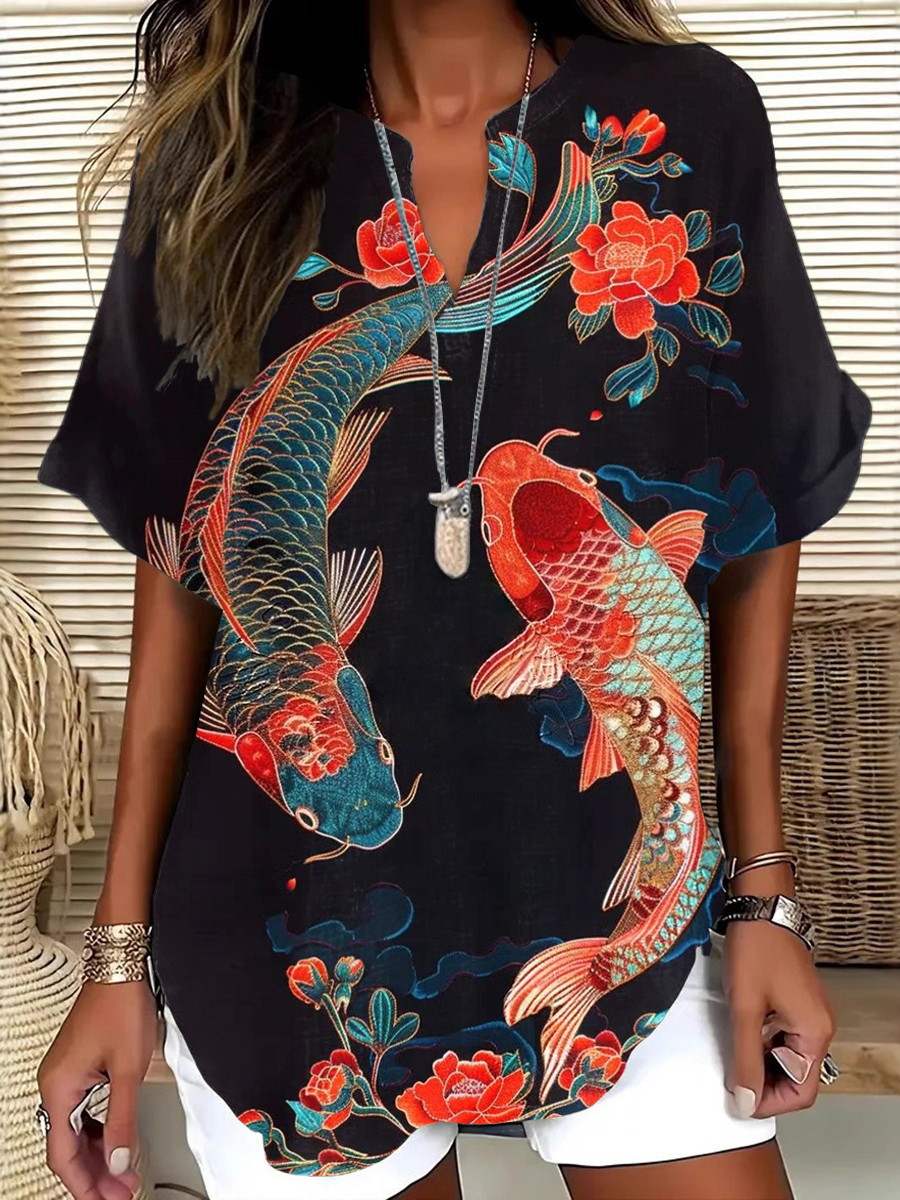 Japanese Art Flower Koi Fish Print Short Sleeve Linen V-Neck Shirt