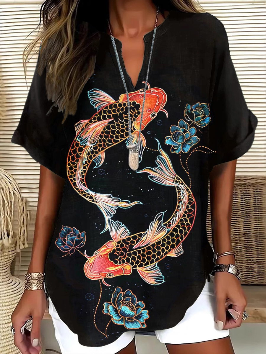 Japanese Art Flower Koi Fish Print Short Sleeve Linen V-Neck Shirt
