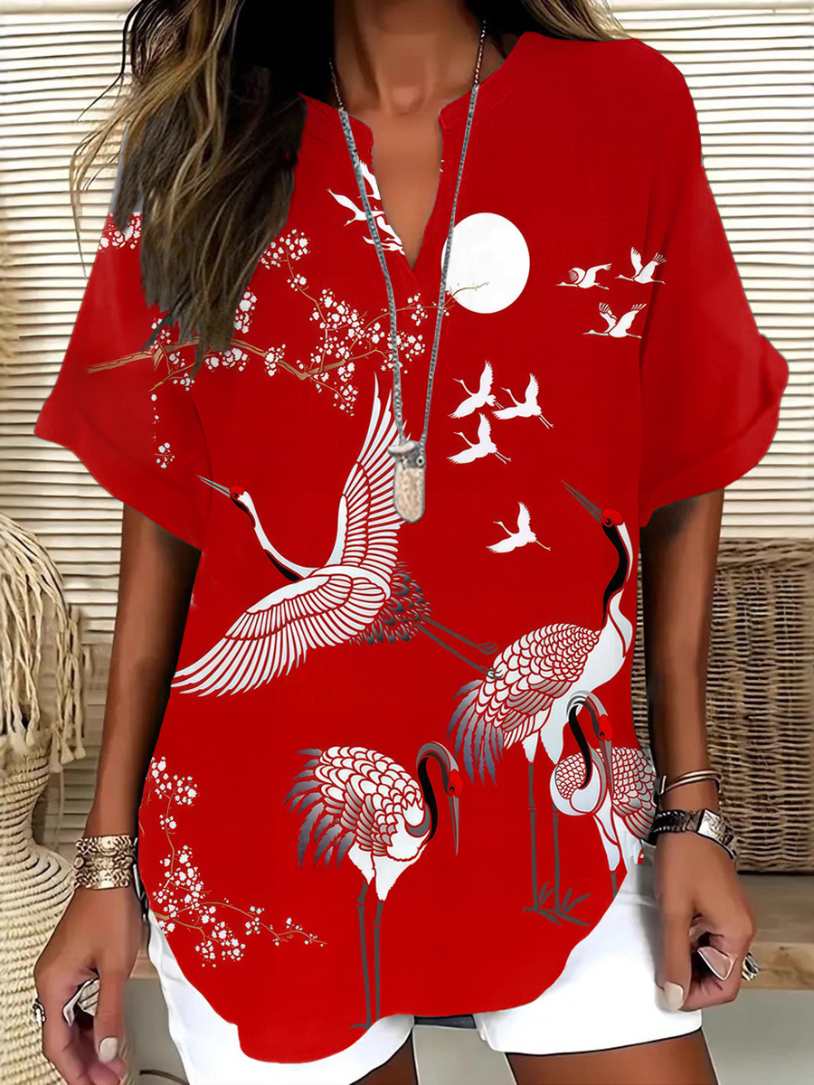 Vintage Crane Art Print Short Sleeve Linen V-Neck Shirt