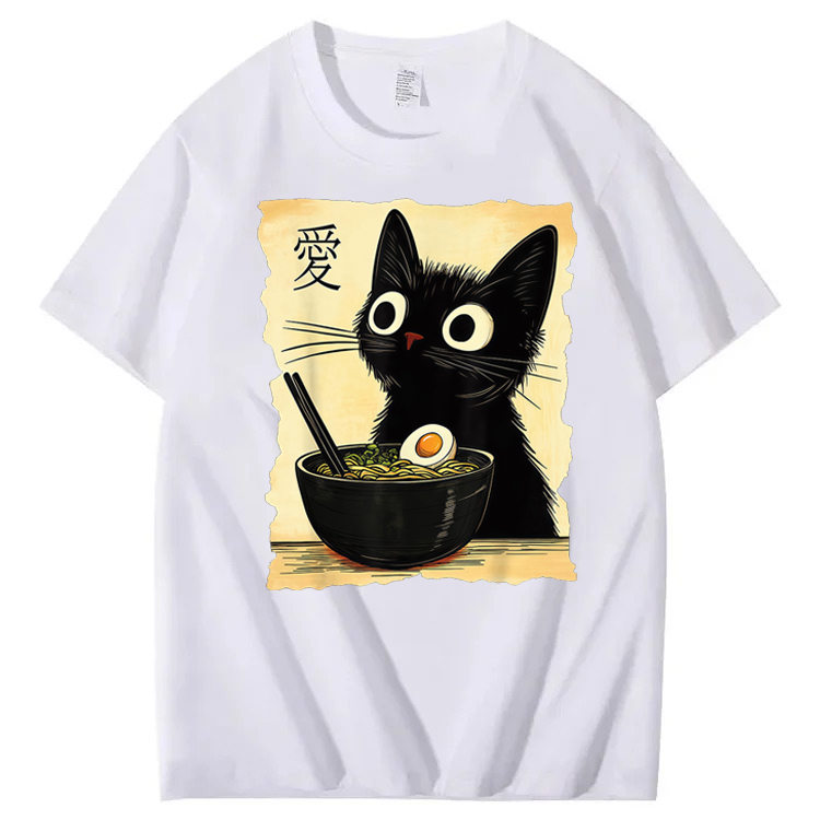 Funny Cat Ramen Graphic Tee Japanese Kawaii Anime Cat 100% Cotton T-Shirt