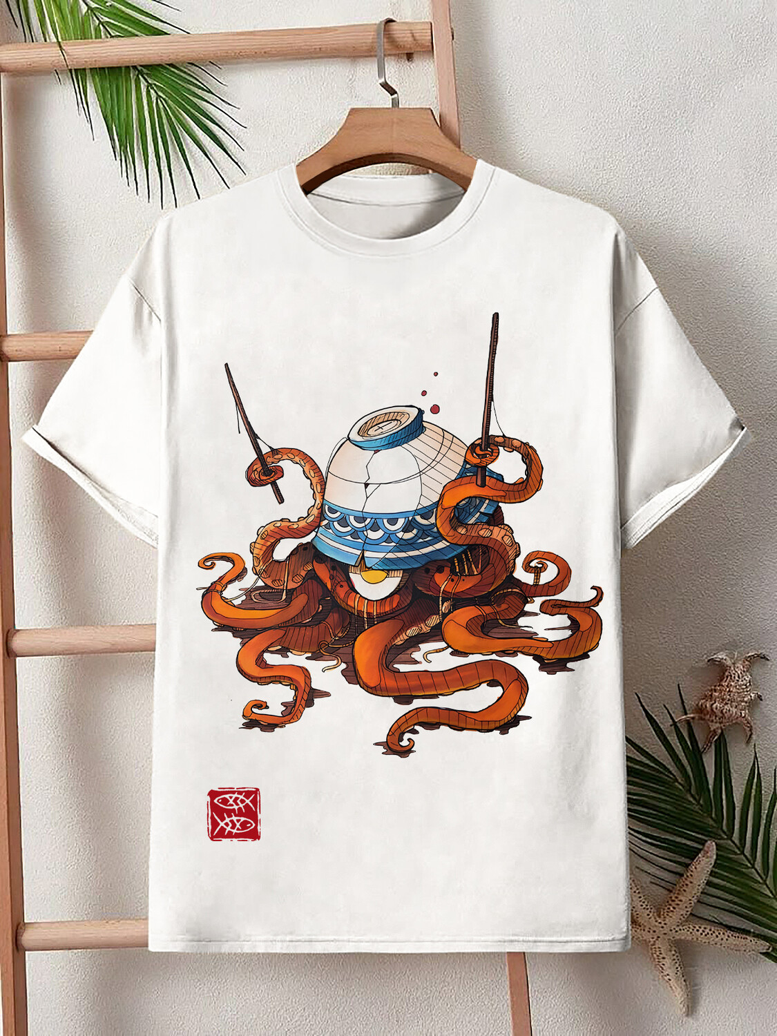 Fun Octopus Ramen Graphic Print Cotton Casual T-Shirt